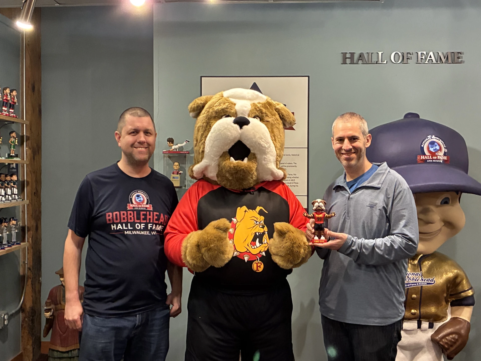 “This is awesome,” Novak said of the Bobbing Brutus, depicted with paws outstretched and wearing a red Ferris State football jersey. “We sometimes have mascots in the museum, but I don’t think we’ve ever had a mascot here presenting a bobblehead of himself. This is great!”